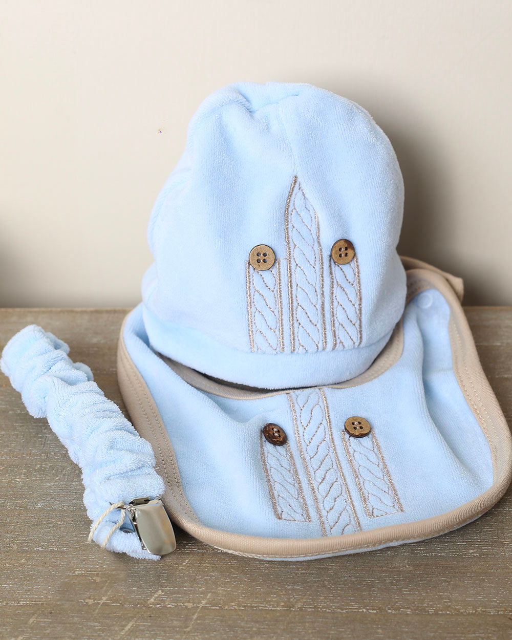 Set Cappellino+Bavetta+Portaciuccio "Isabel & Martinez"